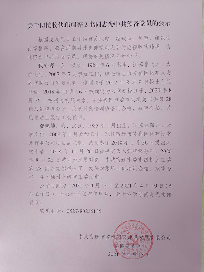 關(guān)于擬接收伏瑋璟等2名同志為中共預備黨員的公示