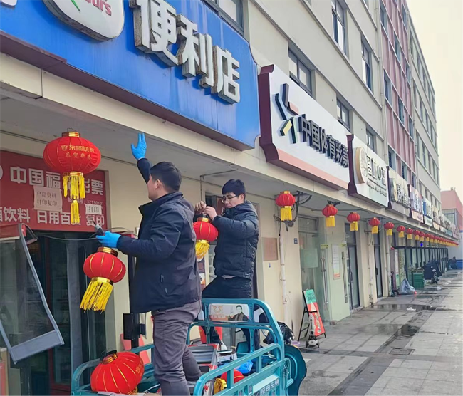 物業(yè)管理部工作人員扛上梯子,拿著燈籠,為沿街商鋪門(mén)前掛上了一個(gè)個(gè)大紅燈籠,將我們商業(yè)區(qū)裝點(diǎn)的漂漂亮亮。過(guò)年掛燈籠是中國(guó)傳統(tǒng)習(xí)俗,紅色代表喜慶,圓形燈籠則寓意團(tuán)圓美滿,紅燈籠象征著平安祥和和紅紅火火。建發(fā)公司希望商鋪們?nèi)兆舆^(guò)的紅紅火火,過(guò)一個(gè)平安祥和幸福年。