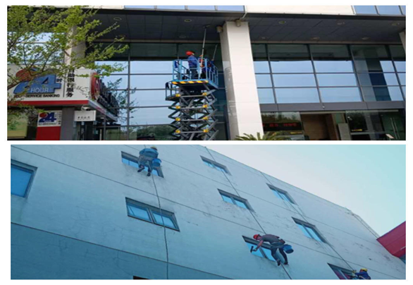 在安全施工的同時嚴(yán)格保證服務(wù)質(zhì)量,根據(jù)實(shí)際情況制定專業(yè)清潔方案,選用專業(yè)外墻清洗劑和玻璃清潔劑,結(jié)合使用了升降機(jī)、吊繩等方式進(jìn)行施工操作,對管理樓外墻、幕墻、瓷磚墻面、燈具及道路等衛(wèi)生死角徹底清潔。