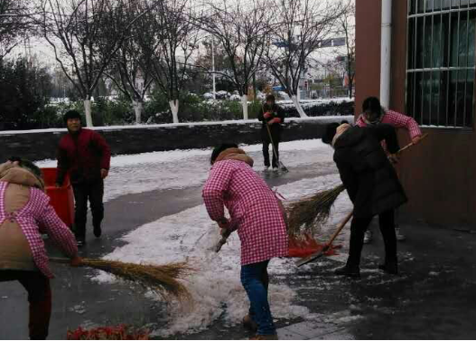 次日氣溫驟降,零下4度,多數(shù)路面存在結(jié)冰現(xiàn)象,加上路面落葉較多。天未亮,保潔、安保人員就到達(dá)園區(qū)公舍主干道、單元門、地庫(kù)出入口等指定區(qū)域,伴隨著凜冽的寒風(fēng),開始除雪化冰。對(duì)于他們來(lái)講,這注定又是忙碌的一天,經(jīng)過(guò)2個(gè)小時(shí)緊張而有序的忙碌,基本完成了各個(gè)園區(qū)公舍各個(gè)路面、單元門、非機(jī)動(dòng)車道、地庫(kù)出入口積雪的清掃工作。