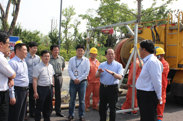 在同里湖路,李榮錦認(rèn)真聽(tīng)取了園區(qū)城市排水防澇工作進(jìn)展情況匯報(bào),現(xiàn)場(chǎng)查看了管道疏通清淤工作,并詳細(xì)詢(xún)問(wèn)了管道CCTV檢測(cè)流程等情況。