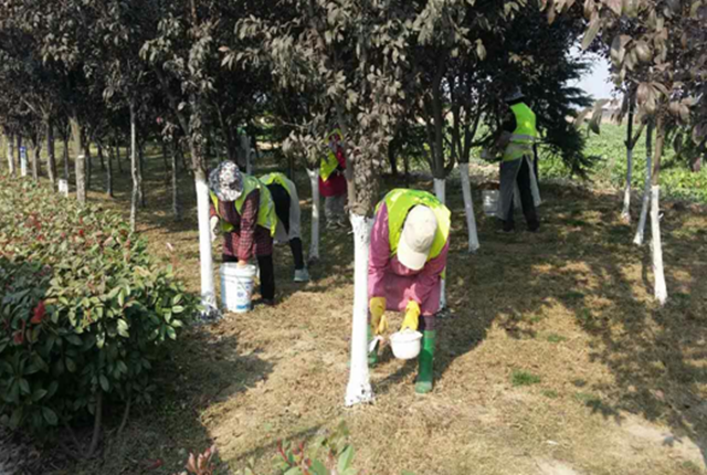 樹(shù)干涂白,目的是防治病蟲(chóng)害和延遲樹(shù)木萌芽,還可以提高苗木抗寒、抗病蟲(chóng)害能力,保樹(shù)木安全過(guò)冬,為明年樹(shù)木良好生長(zhǎng)打下基礎(chǔ)。